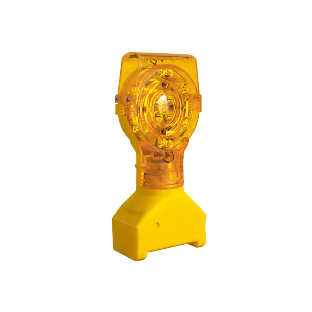 Lampara intermitente de seguridad vial, fabricada en acrílico y ABS, con base de polietileno. Cuenta con 7 leds destellantes color ámbar. Base o mango para insertar en cono o desviador, alimentación por medio de celdas solares.