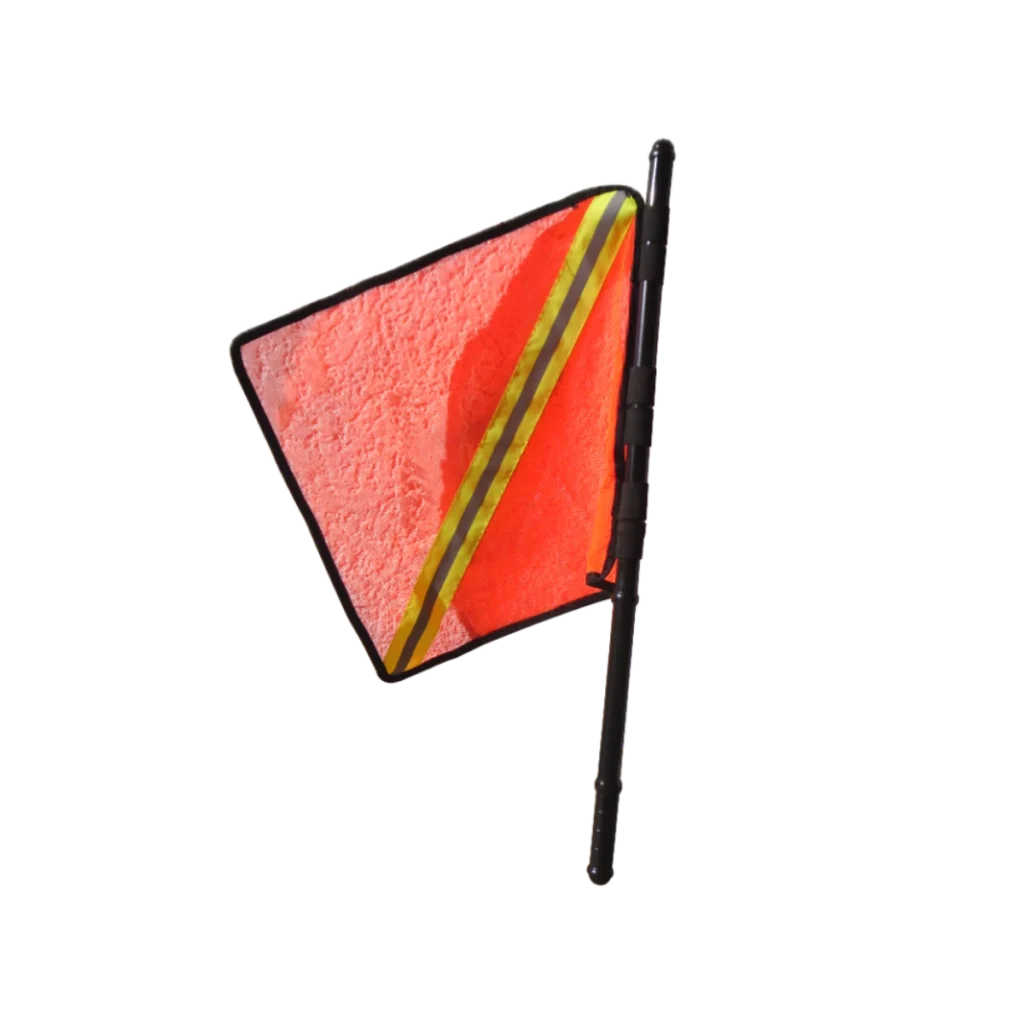 Banderola de una cara fabricada en malla spot 100% poliester, material lavable, ribete de polipropileno color negro de 1″, color naranja con mango negro de PVC.