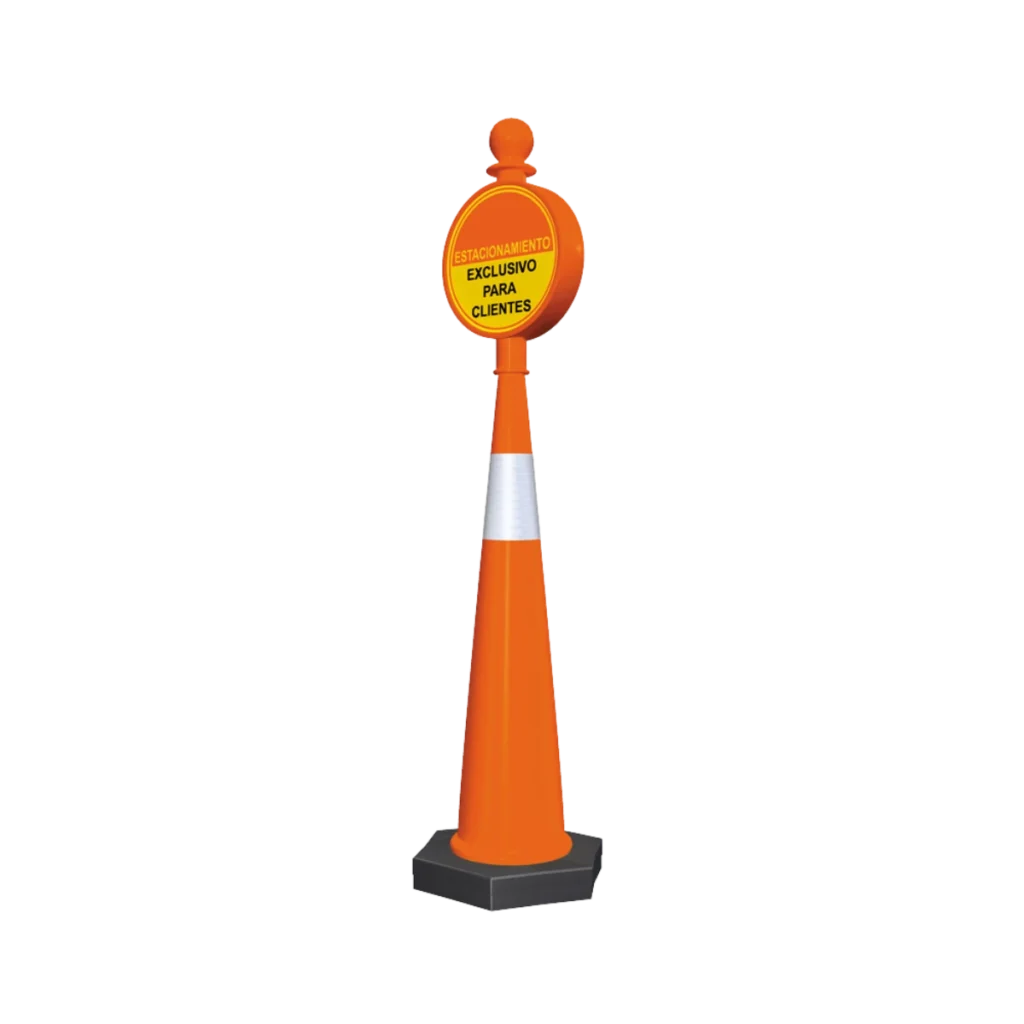 Cono diseñado especialmente para crear un llamado de atención en los automovilistas y peatones debido a que el mensaje queda a la altura perfecta para no pasar desapercibido a la vista. Se usa para crear avisos de advertencia en obras viales, accidentes o desastres naturales, o para anunciar sitios de taxis, paraderos de autobuses, restaurantes, estacionamientos, o restringir accesos en plazas o calles. Es un cono muy estable ya que la base puede ser llenada con arena para incrementar el peso. Dentro de las opciones para hacerlo más llamativo se puede incluir una o varias bandas de reflejante o lámpara con luz de destellos. Fabricado en polietileno de media densidad con U.V.