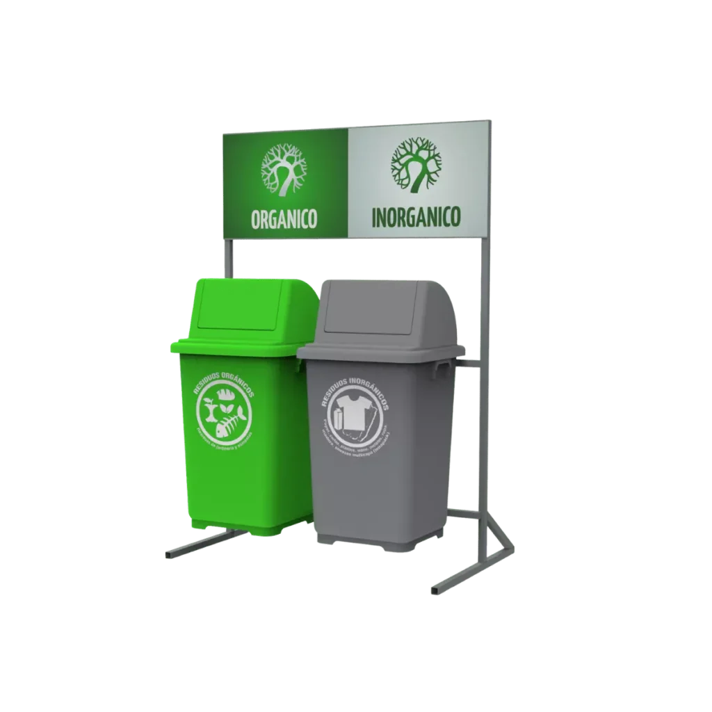 Estación de Reciclaje de dos contenedores BCTB90 en línea, sin ruedas. La estructura esta fabricada de PRT de 2″x2″, PTR de 2″x 1″. Un eje de soporte de metal galvanizado. El espacio publicitario lleva lamina galvanizada calibre 18, conforme a la NOM034.