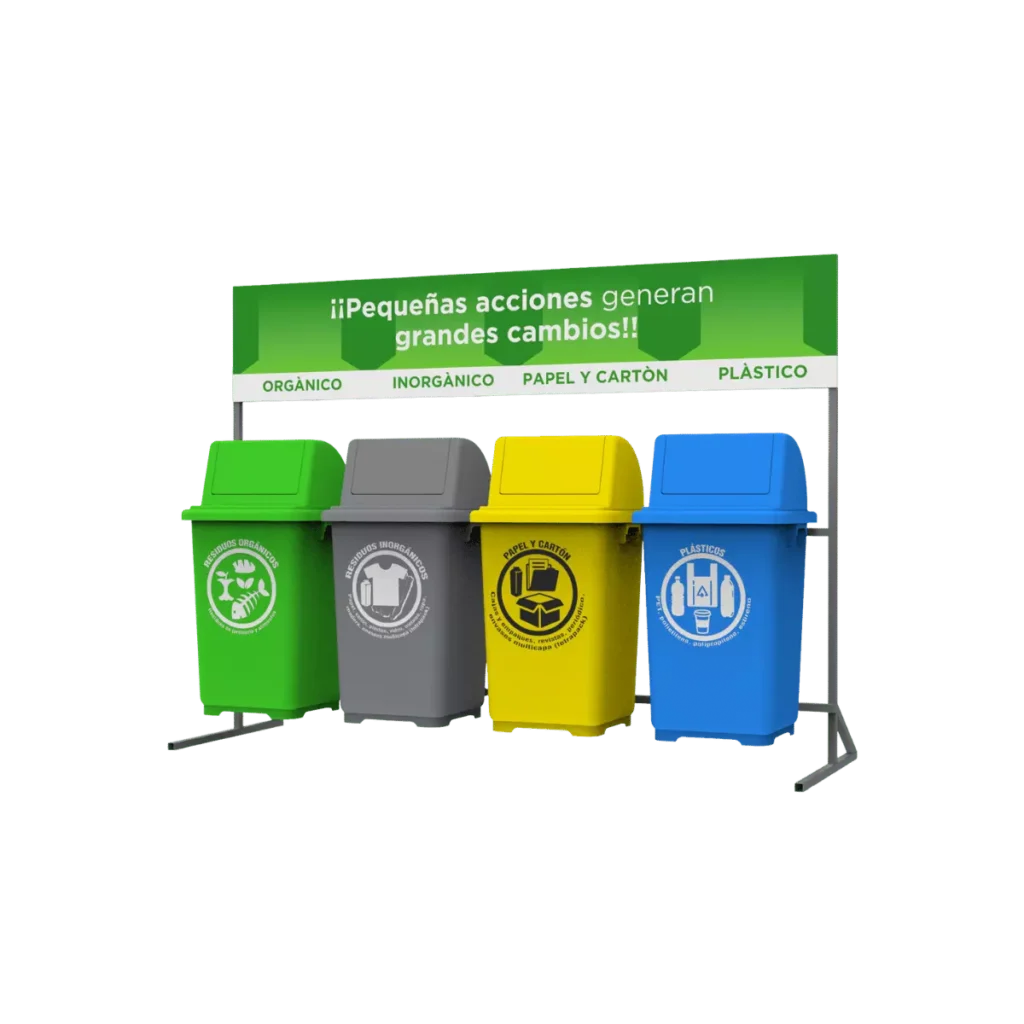 Estación de Reciclaje de dos contenedores BCTB90 en línea, sin ruedas. La estructura esta fabricada de PRT de 2″x2″, PTR de 2″x 1″. Un eje de soporte de metal galvanizado. El espacio publicitario lleva lamina galvanizada calibre 18, conforme a la NOM034.
