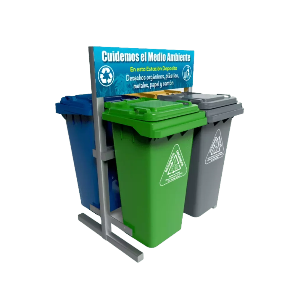 La ESTACIÓN DE RECICLAJE cuenta con una combinación de contenedores VIC-120HD, fabricado con polietileno de alta densidad, reuniendo las más altas condiciones de fluidez, gran resistencia a golpes o roturas. Su producción es mediante el proceso de inyección, lo que permite fabricar todo el cuerpo en una sola pieza, sin partes remachadas, esto ayuda a evitar puntos de tensión o fragilidad.