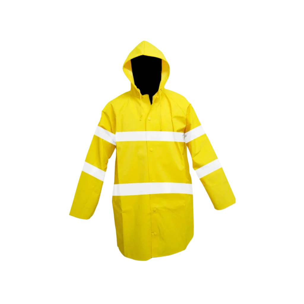 Impermeable de PVC tipo gabardina confeccionado en una sola pieza, con capucha integrada, broches plásticos para cierre hermético, jareta en capucha para ajustarlo en la cabeza. Cuenta con dos tiras reflejantes de 2″ en pecho, espalda y brazos. Disponible en color amarillo.