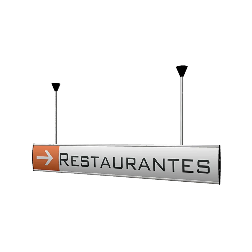 Señal premium con avisos gráficos especiales para colgarse en plafones, techos, escaleras, cuenta con base plástica para una mejor fijación, en gran variedad de tamaños para múltiples mensajes. Película anti reflejante. Fabricado en perfil de aluminio natural, anodizado, satinado, curvo extruído.