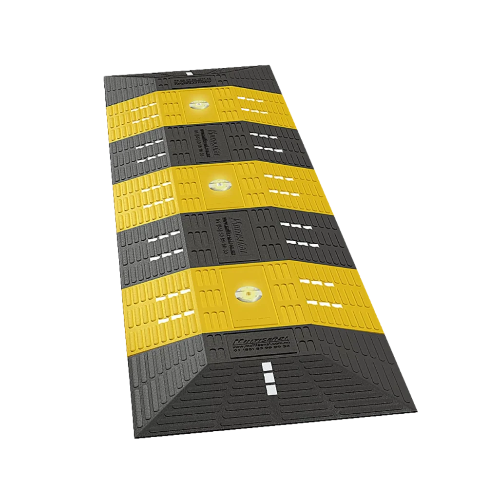 Reductor de velocidad de gran tamaño, recomendado para colocarse en zonas escolares o pasos peatonales, altura adecuada que no rozar la parte baja de los vehículos. Líneas en alto relieve que crean un ligera vibración, y reflejantes en cada módulo aumentando su visibilidad. Formado por módulos ensamblables para diferentes largos. Como opción se puede incluir iluminación solar de 6 a 12 leds para mejor visibilidad durante la noche. Fabricado en polietileno de alta densidad con U.V., colores que no se decoloran.