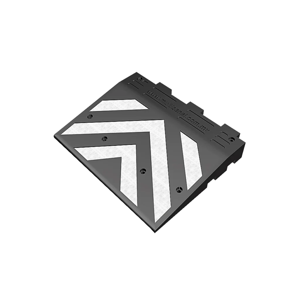 Diseñada para reducir la velocidad y evitar situaciones de riesgo hacia los peatones, ciclistas y motociclistas. Muy resistente al paso constante de vehículos. Superficie antiderrapante. Se fija al suelo mediante tornillos y taquetes. Son interconectables para cubrir diferentes áreas. Incluye reflejante. Fabricado en polietileno.